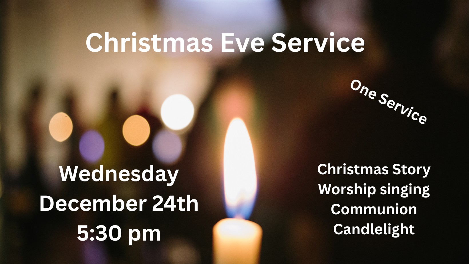 You are cordially invited to attend our annual Christmas Eve Candlelight Service Wednesday December 14th at 5:30 pm. Seating & Parking are limited so please get here early. We will be celebrating the Christmas Story, Communion, Worship Team Songs, and Candlelighting. Mark your calendar now.